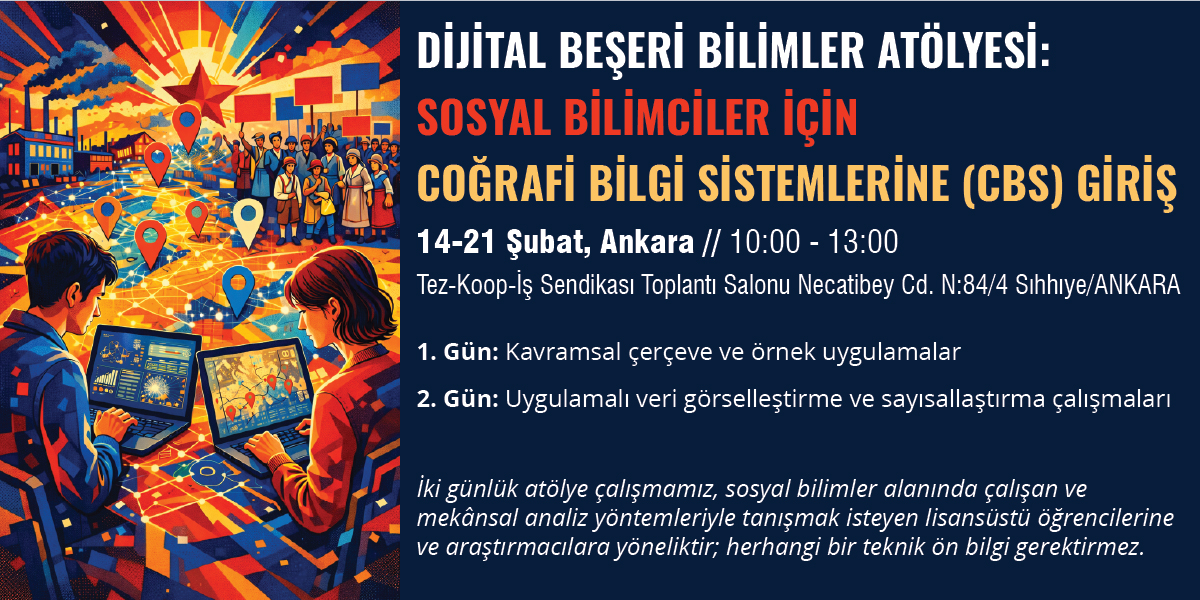 Bu atölye, coğrafi bilgi sistemlerinin sosyal bilimler alanındaki kullanımına odaklanmaktadır. Atölyenin temel amacı, katılımcıların mekânsal düşünme becerilerini geliştirmek; güncel ve tarihsel veri setleri üzerinden CBS’nin araştırma süreçlerine nasıl entegre edilebileceğini hem teorik hem de uygulamalı olarak göstermektir.